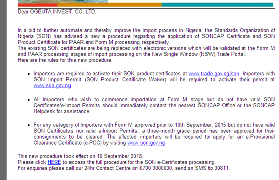 3、任何品类商品的进口商,如果拥有在2015年9月10日前获得了FORM M,但是没有有效的SON证书或有效的电子进口许可证,拥有三个月的宽限期来清关他们的货物。受到影响的进口商需要在www.son.gov.ng上申请一个电子临时清关证书(E-PCC)。